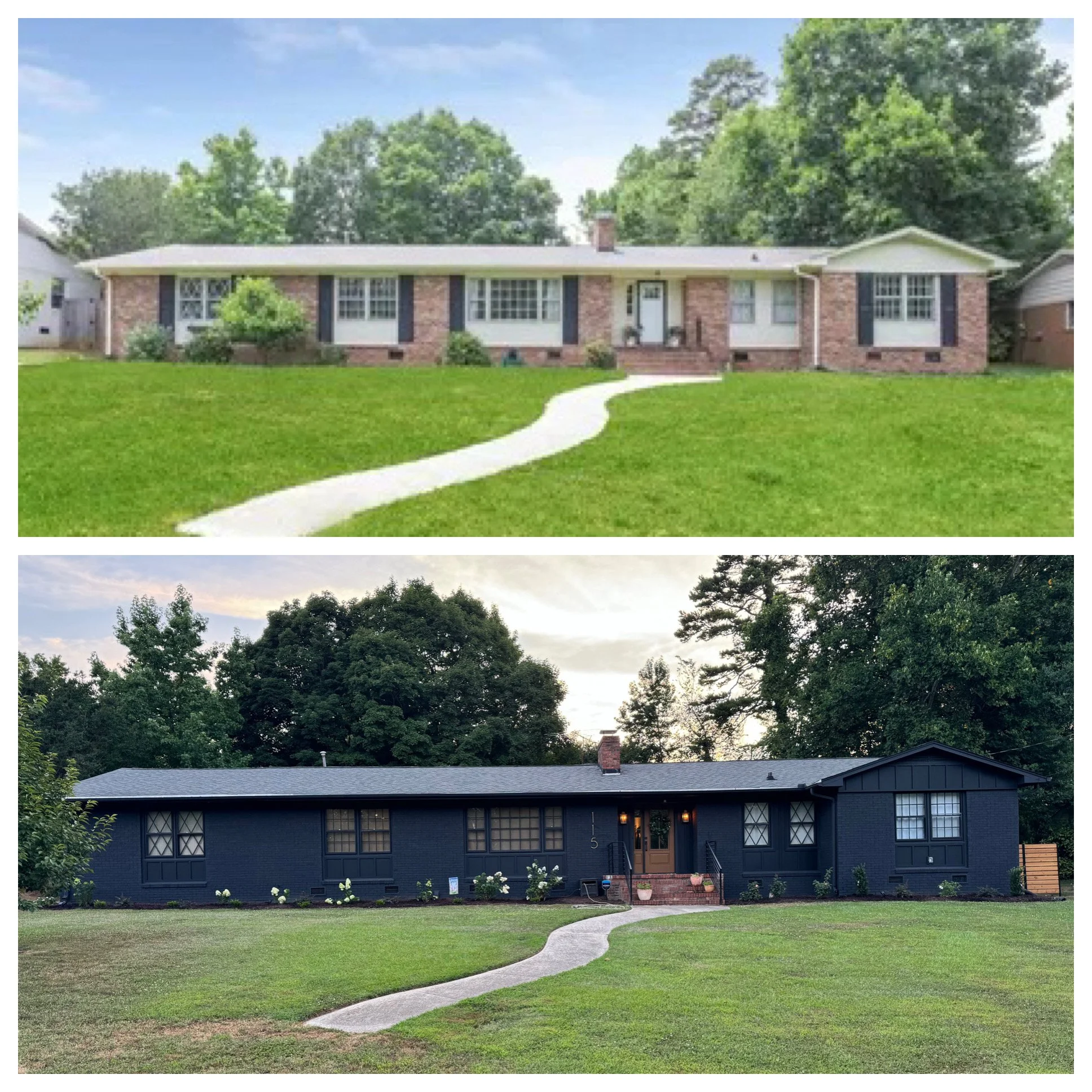 The most noticeable transformation to date in the outside of our home. We both individually dreamed of a black house. Which speaks to our kindred spirits. So we knew right away that we wanted to prioritize painting the exterior a deep, matte black. We added brass lanterns, over-sized mid-century inspired numbers, board and batten details, fresh landscaping, as well as wooden and iron elements to give this exterior new life.